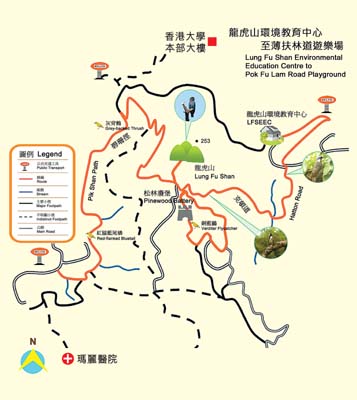 由龍虎山環境教育中心出發,經克頓道到達龍虎山山頂及松林廢堡,可在沿途經過的植林