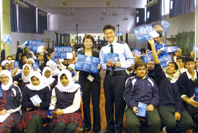 通及鼓勵非華裔學生畢業後參與警務工作,警察招募組聯同東區警民關係組三月二十二日在伊斯蘭脫維善紀念中學舉辦警察職業講座,吸引逾百名師生參加。 招募組高級督察李英華及警員劉建章詳細介紹警察的入職條件、遴選程序,以及警隊要求每名新入職人員的核心才能等。 出席學生表現得甚有興趣,認為警務工作很有意義及充滿挑戰,他們細心聆聽講座內容,並把握發問機會,向招募組人員查詢加入警隊的詳情。 由於大部分學生不諳中文,在學習中文方面遇到困難,他們因此擔心未能符合警隊對中文程度的要求而影響了投考警察的信心。為減輕他們的憂慮及加強信心, 招募組特別詳細講解有關中文能力的要求及提供學好中文、預備筆試及面試的要訣。 校長羽智雲感謝警察招募組及東區警民關係組悉心安排,並讚揚講座達成三個目標-讓非華裔人士與警務人員建立緊密聯繫、讓有志加入警隊的非華裔人士對警 務工作加深認識,及加強他們對成功投身警隊的信心。