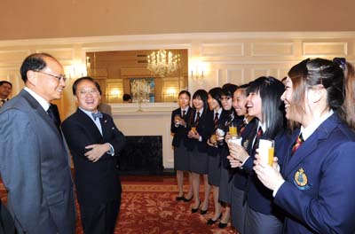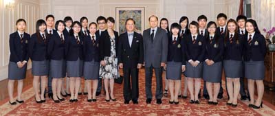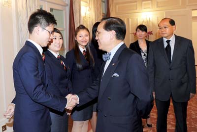 十二日在禮賓府接見前往加拿大作親善訪問的滅罪大使,祝願他們行程順利,收穫豐盛。 二十一位滅罪大使來自「�生銀行之協助警方撲滅青少年罪行比賽二○一○」中學組、專上學生組和非政府機構(青少年服務及制服團體)組別的優勝者。他們 於八月十九日啟程往加拿大訪問八日,行程包括探訪溫哥華和里賈納的警察和其他政府部門。 曾蔭權恭賀他們在比賽中脫穎而出,表現出優秀的領導才能和分析能力。 今屆比賽以「打擊青少年吸食危害精神毒品及打擊資訊科技罪案」為主題,曾蔭權衷心祝賀各滅罪大使,並呼籲他們繼續關注打擊網上罪行,把滅罪及反吸毒的 信息帶給同學、朋友及社區。 他也希望他們把握這次機會好好學習,並向海外的朋友介紹香港的最新情況和帶出滅罪信息。 滅罪大使與其他得獎者於七月十四日在警察總部舉行的頒獎典禮上,接受警務處處長鄧竟成及�生銀行總經理兼財資及投資業務主管馮孝忠頒發獎牌及獎學金。 鄧竟成在典禮上讚揚各優勝者表演卓越,並寄語他們要肩負滅罪大使的責任,樹立良好榜樣,將滅罪信息傳給身邊每一個人。 馮孝忠亦表示:「�生銀行已經連續九屆支持此活動,一直積極培育社會未來的主人翁,期望藉比賽提醒青少年遠離罪惡,建立健康生活模式。」他鼓勵青少年 發揮所長,協助警方撲滅罪行。 這項兩年一度的比賽由警務處主辦及�生銀行贊助,今年吸引了超過十四萬人次參加,打破歷年紀錄。參賽者須分三階段完成多個項目,包括網上遊戲、問答比 賽、閱報報告、寫作、專題研習、才能測試及面試。 曾蔭權與滅罪大使交談。