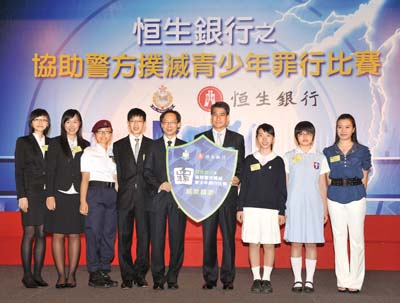 經理兼財資及投資業務主管馮孝忠(左五)在七月十四日舉行的頒獎典禮上與「�生銀行協助警方撲滅青少年罪行比賽二○一○」各組別的冠軍得獎者合照。