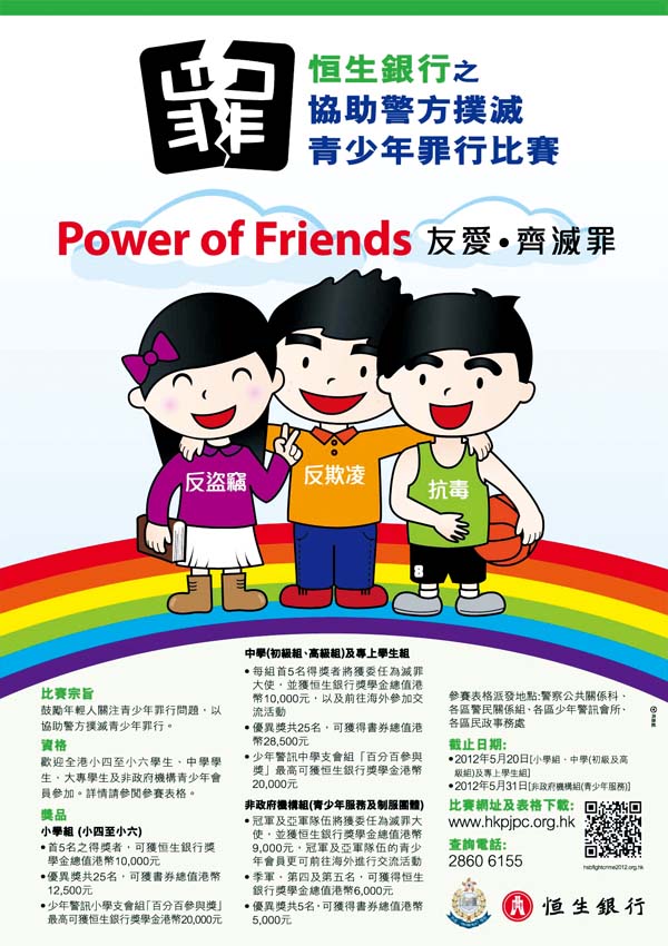 撲滅青少年罪行比賽二○一二」於四月三十日正式展開。比賽主題為「友愛‧齊滅罪」,宣揚「抗毒」、「反盜竊」及「反欺凌」三大訊息。 這項兩年一度的比賽是本港大型防止罪行活動之一,自一九七五年起由警務處主辦,並由一九九四年開始獲�生銀行全力贊助。比賽的目的是提高年青一代對青 少年罪行的關注,並鼓勵他們與警方攜手撲滅罪行。 比賽分為小學組(小四至小六)、中學初級組(中一至中三)、中學高級組(中四至中六)、專上學生組,以及非政府機構(青少年服務)組(包括民政事務局 認可的青少年制服團體)。 參賽者將會分三階段接受網上遊戲、問答比賽、閱報報告、寫作、專題報告、領袖才能測試和面試等項目評估。優勝者除可獲獎學金外,更有機會成為香港滅罪 大使,於八月往海外交流訪問。 參加表格可於警察公共關係科、各區警民關係組、少年警訊會所及民政事務處索取,或於少年警訊網頁http://www.hkpjpc.org.hk下 載。小學組、中學初級組、中學高級組和專上學生組的截止報名日期為五月二十日,而非政府機構(青少年服務)組的截止報名日期為五月三十一日。遞交表格的參 賽者均可獲贈香港警察小先鋒精美迷你公仔一個,送完即止。 如有查詢,可致電2860 6155或2860 6143警察公共關係科少年警訊及青少年聯絡組。 ![]() 「�生銀行之協助警方撲滅青少年罪行比賽2012」的網上滅罪遊戲已上載至 http://hsbfightcrime2012.org.hk。 取得最高分數的首十名參賽者,可獲一套六款的香港警察小先鋒精美迷你公仔,將以電郵通 知各得獎者領獎詳情。 網上滅罪遊戲介面。 香港警察小先鋒迷你公仔的六款造型。 參加者可透過智能手機程式讀取QR