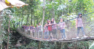 一眾少訊經過吊橋進入沙巴五大民族文化村參觀。