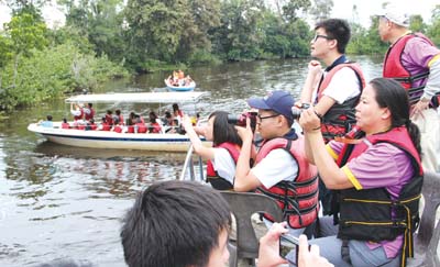 少訊於野生動物園區內乘坐小艇,紛紛舉起相機捕捉沙巴野生生態。