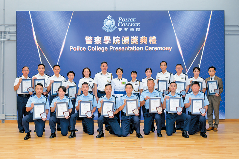 警察學院(學院)院長陳綺麗(後排中)於十月十五日主持頒授典禮,向73位紀律及文職人員頒發警察長期服務獎章及加敘勳扣、指揮官嘉獎,及2025學院最佳教官獎,以表揚他們傑出的工作表現及對警隊的貢獻。
