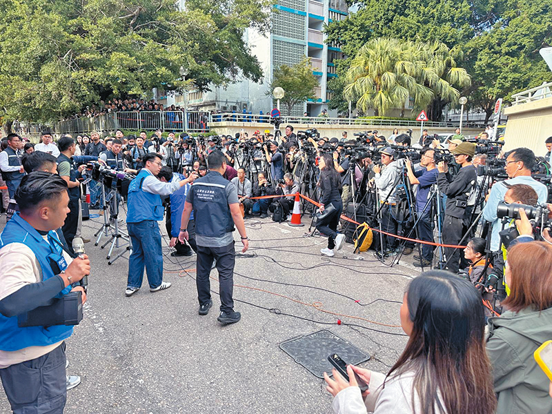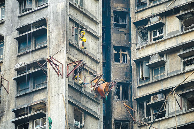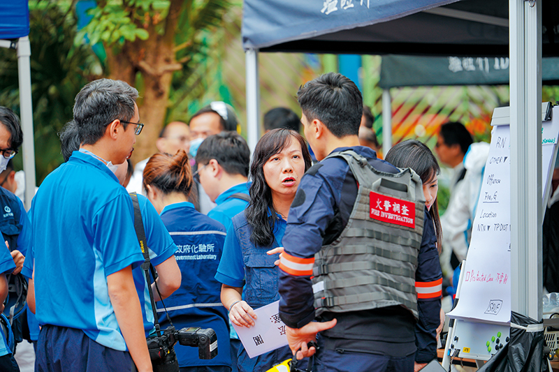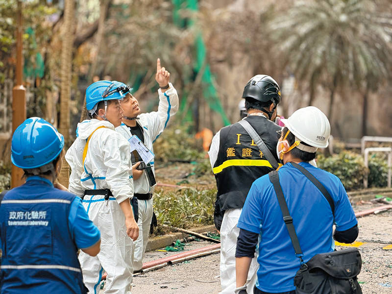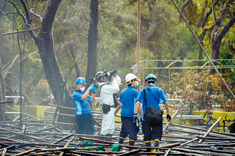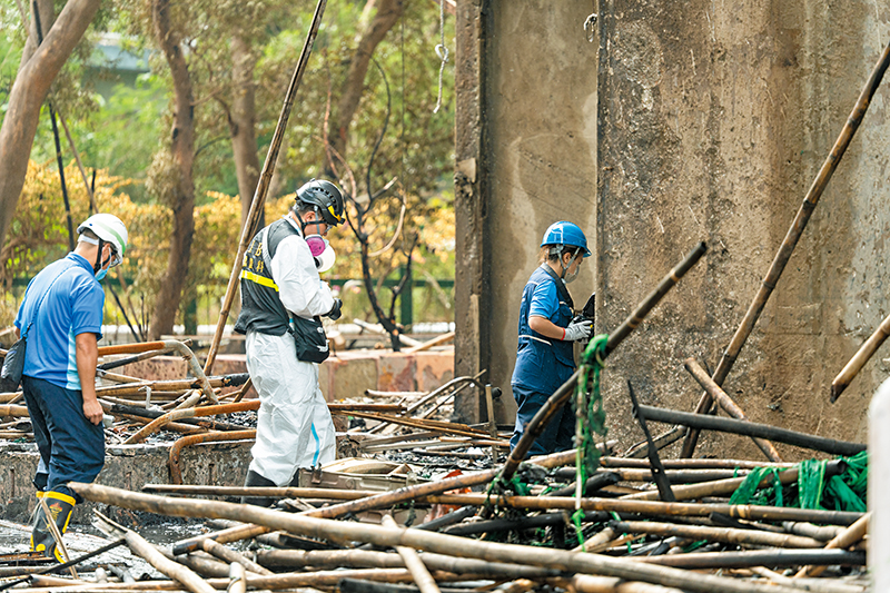 灾难遇害者辨认组、鉴证科人员及其他政府部门的代表于火灾现场搜证。