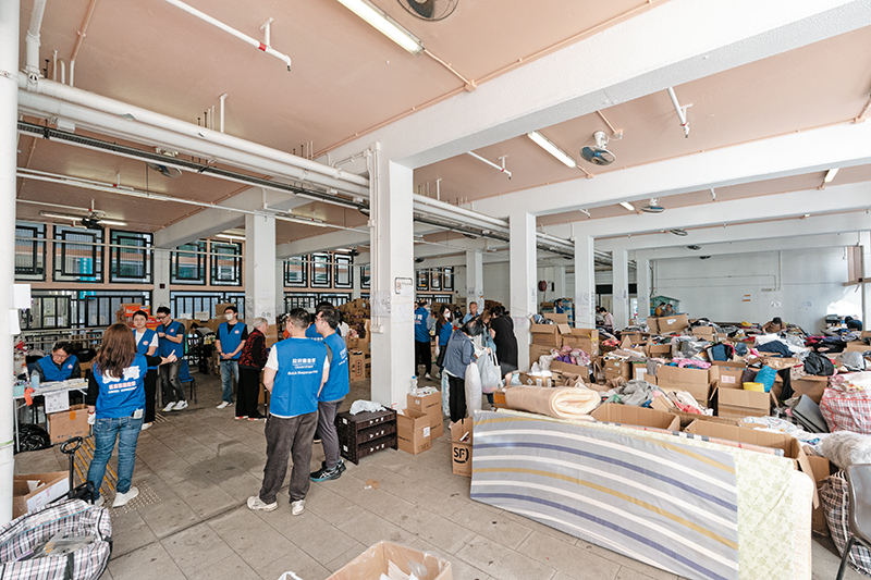应急队与地区服务及关爱队伍协助处理给受影响居民的物资。