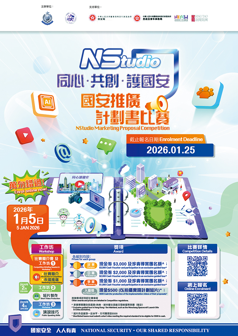 为向年青人推广「国家安全,人人有责」的信息,国家安全处(国安处)于二零二五/二六学年推出「NSynergy国安互动‧主动‧齐行动」活动。「NStudio同心‧共创‧护国安」国安推广计划书比赛亦于十二月推出,对象为小四至中六学生。活动奖品丰富,参加者更有机会参与主题工作坊,学习市场推广、短片制作及演说技巧。