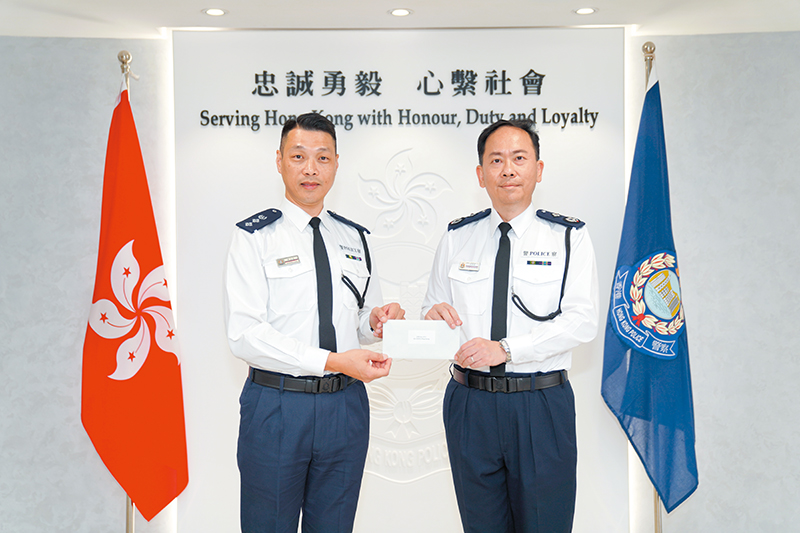 The Commandant of the Hong Kong Auxiliary Police Force (HKAPF) Dr Leung Sai-kwong (right) presented a promotion letter to Mr Cheng Wing-cheong, who has been promoted to Chief Superintendent (Auxiliary), at the HKAPF Headquarters on December 20, 2025.