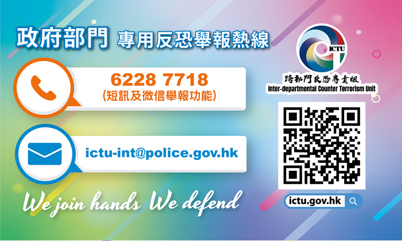 跨部门反恐专责组(反恐专责组)于一月一日启用政府部门专用反恐举报热线6228 7718,以提升跨部门情报协作效益。为配合政府「三层防范机制」,该热线专责接收所有政府部门的举报或查询,新热线号码亦包含短讯及微信举报功能。反恐专责组将不时检视热线运作情况,并按需要扩充举报渠道。