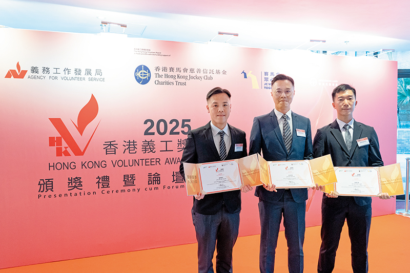 民政及青年事务局与义务工作发展局于一月九日举行香港义工奖2025颁奖礼。时任新界北总区冲锋队警员翁振杰、时任秀茂坪警区警长郭凯杰及柴湾分区警长钟肇恒荣获本年度「义勇奖」。翁振杰于二零二四年十二月十八日休班期间,在将军澳广场协助扑灭火警;而郭凯杰和钟肇恒则在二零二五年四月二十七日休班期间,合力制服一名情绪激动的持刀男子,解除现场威胁。两宗案件均获传媒报道,即扫二维码重温。