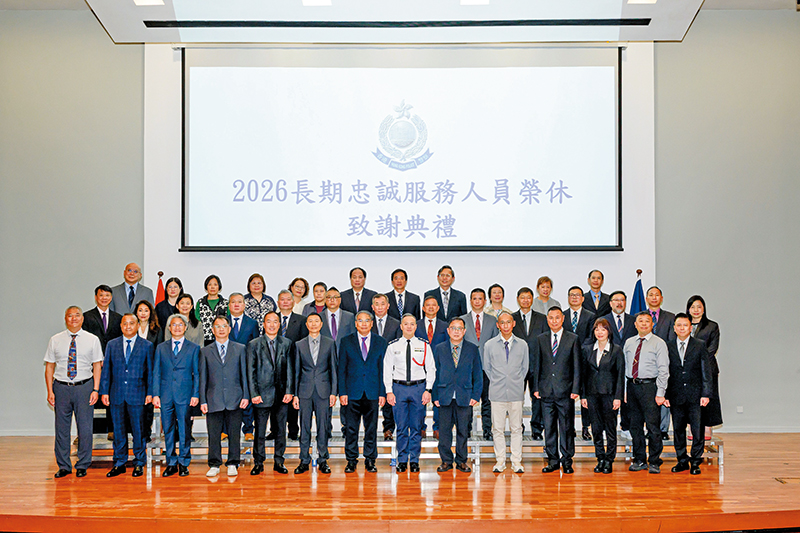 Commissioner Chow Yat-ming (seventh right, front row) presented Valedictory Letters, Certificates of Exemplary Service and retirement souvenirs to 81 police officers and civilian staff members at a presentation ceremony held on February 27 for their exceptionally long and loyal services. The Commissioner thanked the retiring officers for dedicating to duties over the years, upholding the professionalism of the Force, and safeguarding Hong Kong.