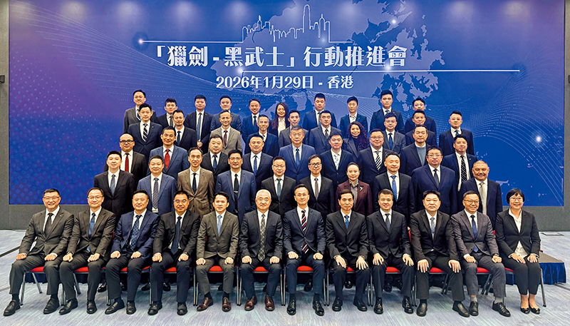 警队于一月二十九日在警察总部主办「猎剑 • 黑武士」行动年度推进会,由刑事及保安处处长陈东主持,共51名人员参加,当中包括国家禁毒委员会常务副秘书长及公安部禁毒局局长魏晓军、澳门司法警察局副局长苏兆强及香港海关助理关长(情报及调查)黄浩然。