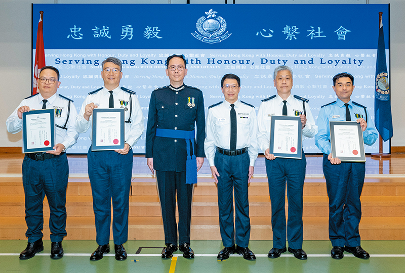 香港辅助警察队(辅警)总监梁世光博士(左三)于二月二十八日在辅警总部举行颁授典礼,向超过110名辅警队员颁授香港辅助警察长期服务奖章、加叙勋扣及指挥官嘉奖,以表扬他们杰出的工作表现及对警队的贡献。