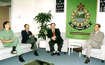 LED by Director Lin Jieyuan, eleven representatives of the Guangdong Border Defence Bureau recently paid a familiarisation visit to the Hong Kong Police Force. They were welcomed by CP Eddie Hui Ki-on, DCP OPS Peter Wong Tsan-kwong, D OPS Ng Ching-kwok and ACP OPS Foo Tsun-kong. | ![]() SSP OPS Fung Kwok-on, D OPS Ng Ching-kwok, Guangdong Border Defence Bureau Director Lin Jieyuan, and DCP OPS Wong Tsan-kwong |
