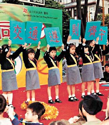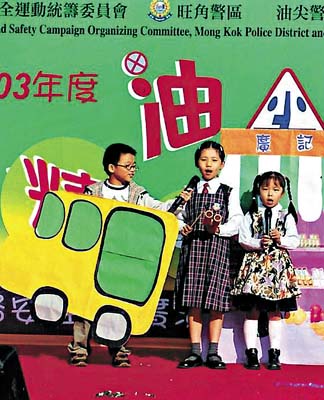 A road safety publicity drive has recently been launched by the Mong Kok and Yau Tsim Police Districts and the Yau Tsim Mong Road Safety Campaign Committee. A bus parade and a carnival were held as part of the 2002/03 Yau Tsim Mong Road Safety Campaign which carried the theme of "Smart Drivers, Clever Pedestrians". During a tour aboard the Force Road Safety bus, Yau Tsim Mong Road Safety Campaign Committee Chairman, Mr Wong Chi-ming, together with members of the committee, visited various traffic accident blackspots in the districts and handed out leaflets and souvenirs to residents. Residents participated in the carnival which featured games, Police vehicle display, inter-school 'Road Safety' Performance Competition, as well as performances by students. Officiating guests at the carnival included Mong Kok District Commander, Mr To Chun-wai; Yau Tsim District Commander, Mr John Bicknell; Vice-chairman of Yau Tsim Mong District Board, Mr Ip Kwok-chung; Yau Tsim Mong Road Safety Star, Mr Choi Tse-kin, and community dignities. |