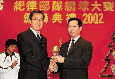 Sham Shui Po District Deputy Divisional Commander, Mr Iain Tse Ho-yin, led his Police Tennis Club team to a hard-fought final victory over long-standing rival, and last year's winner, the Fire Services Department Tennis Club team. The score was 5 - 4, in favour of the Force, for the 7th annual Inter-Disciplined Services Tennis Championship 2002.