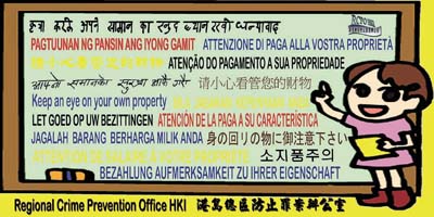 The Regional Crime Prevention Office of Hong Kong Island Region (RCPO HKI) carried out a multi-lingual publicity campaign to prevent "quick cash crimes" last month, targeting local residents but also visitors, tourist and foreign workers in Hong Kong. RCPO HKI mounted the campaign at Statue Square, Victoria Park and the vicinity of the Sugar Street in Causeway Bay, with police vehicles broadcasting an appeal to take good care of personal belongings. Targeting foreign workers in Hong Kong, the appeal was also driven home in Thai, Filipino, Sri Lankan, Indian, Indonesian and Nepalese languages, with the assistance of non-governmental organisations. And for the benefit of the workers, visitors and tourists, RCPO HKI has printed publicity leaflets in different foreign languages, including French, German, Spanish, Japanese, Korean, Philippine and Indonesian. These were distributed with the assistance of volunteer workers from the Police Old Comrades Association, which has pledged full support for police crime prevention efforts. The association will further assist RCPO HKI with similar activities in the year to come.