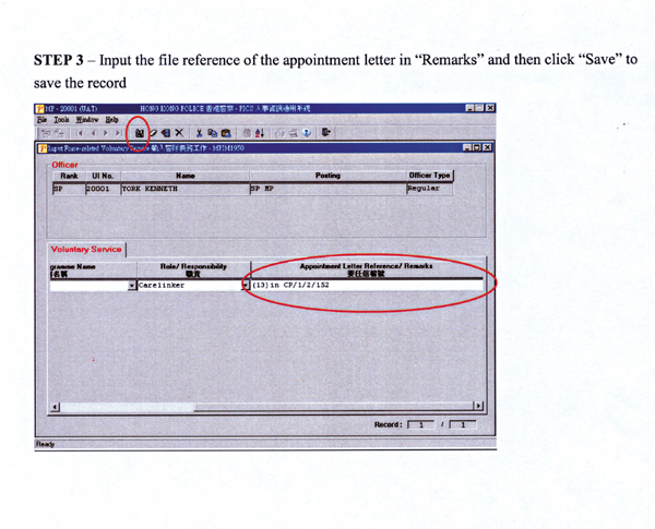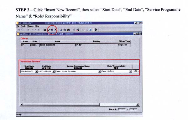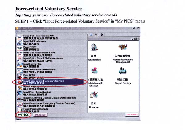 The function for Force-related voluntary service is a new arrangement rolled out last month, allowing the recording of officers' voluntary services organised within the Force, such as those by the Peer Advisors and Carelinkers, to reflect their effort for such services. Unlike the secondary duty records, which are maintained by centralised authorities, officers can input their own Force-related voluntary service records into PICS directly.