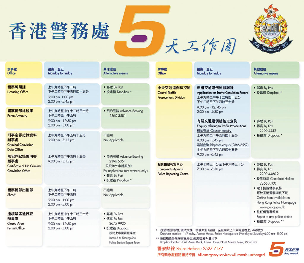當局已批准第二階段第三批計劃,而有關計劃會繼第二批計劃在二○○七年七月一日推行。這次計劃涉及的人員同樣包括提供後勤行政支援服務、參事服務及專業支援服務的人員。 一般來說,執行辦公室職務的人員會在星期六停止服務,但在星期一至星期五延長工作時間,以補足規定工作時數。不過,區交通隊及總區特別職務隊等組別會採用一周五天工作、兩天休息的模式,而休息的兩天無須為星期六、日或相連的兩天。如有需要,這些組別可以繼續提供服務超過五天。 在這次計劃中,也會有七個公共服務辦事處改行五天工作周,包括:禁區通行證辦事處、牌照課辦事處、中央交通違例檢控組公共服務櫃台、警察總部出納部、無犯罪紀錄證明書辦事處、警隊槍械庫及投訴警察報案中心。這些辦事處會由七月一日起停止在星期六辦公,但會延長工作時間,並向公眾提供其他服務方式,使服務維持在同等水平。 其他服務方式包括為申請牌照、投訴警察、查詢交通事宜及申請禁區通行證等櫃台服務設置投遞箱。至於無犯罪紀錄證明書、儲存私人槍械及交通違例判罪紀錄的申請,則鼓勵申請人利用電話預約。各類牌照及交通違例判罪紀錄均可用郵遞申請。(詳情請參閱附表。) 有關公共櫃台服務的服務承諾已作檢討,並會由七月一日起調整,即使不能把時間縮短,仍會維持在同一段時間內為公眾提供同等水平的服務。 至於前線組別,警隊仍繼續研究有關組別進一步改行五天工作周是否可行。