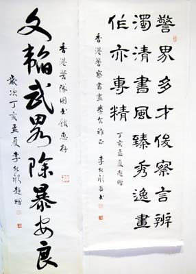 李醫生雅興大發,還為我們即席揮毫,揭開翰墨豪情的序幕。各會友當然筆歌墨舞,體現以筆會高賢。其中一位資深藝友梁棠更即興為我們的「警察書畫藝術雅集」創造五言律詩,內容是:「警隊有文風,察人尚志豐,書章求準確,畫技達溝通,藝裡含新意,術中下苦功,雅來齊遣兵,集合顯神雄。」 最後,李紀欣還用「警察書畫」造成五言絕詩:「警察多才俊,察言辨濁清,書風臻秀逸,畫作亦專精。」贈予本會。另外又以書法「文韜武略除暴安良」字句贈予香港警隊圖書館惠存。筆後,我們還繼續燒烤聯誼,吟詩對飲。 香港警察書畫會推行「一人一活動,一人一藝術」繼續不遺餘力。