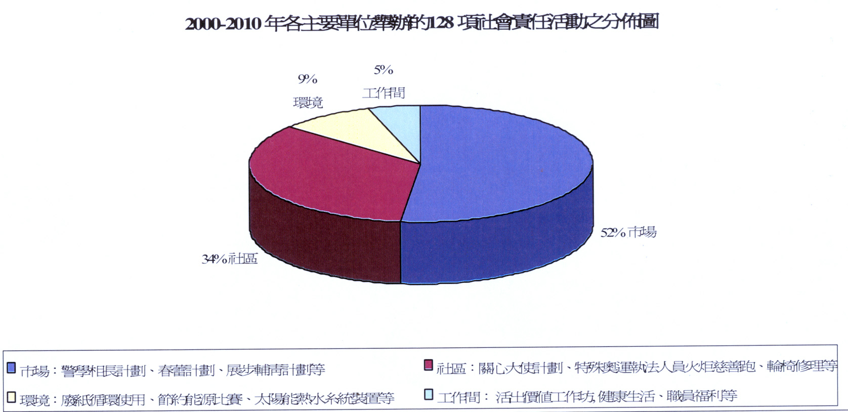 在推行《二○○○至二○一○策略行动计划》和以往的研究中,我们把警队各主要单位推行的一百二十八项社会责任项目或活动,按「四大支柱模式」分类,大致可 分为环境(百份之九),社区(百份之三十四),市场(百份之五十二)和工作间(百份之五)。这些数字可勾划出警队在最近两年的社会责任活动类型取向。 社会责任管理方法