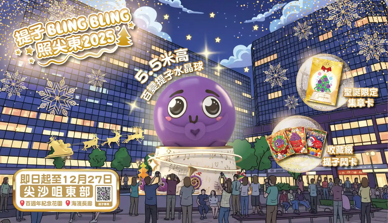 今年活動特別打造兩大全新視覺亮點:在尖東百週年紀念花園噴水池上方建造5.5米高的巨型LED球體「百變提子水晶球」,播放「提子」9種可愛表情及聖誕水晶球動畫,成為尖東夜景中矚目的動態焦點。同時,在百週年紀念花園上方亦架設巨型天幕,掛上漫天以「提子」造型設計的閃爍燈飾,營造出沉浸式的「提子聖誕步道」,與「百變提子水晶球」互相輝映,共同閃耀尖東!
