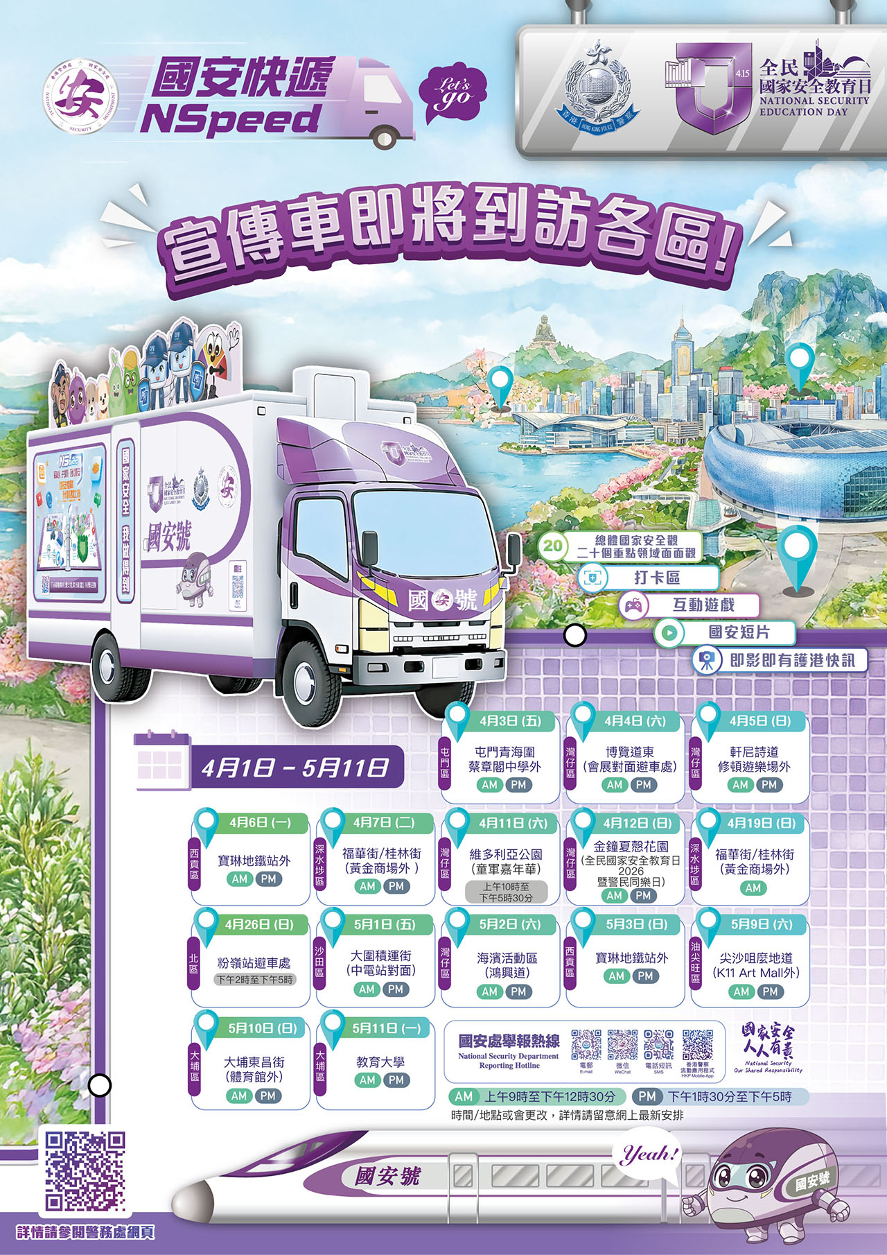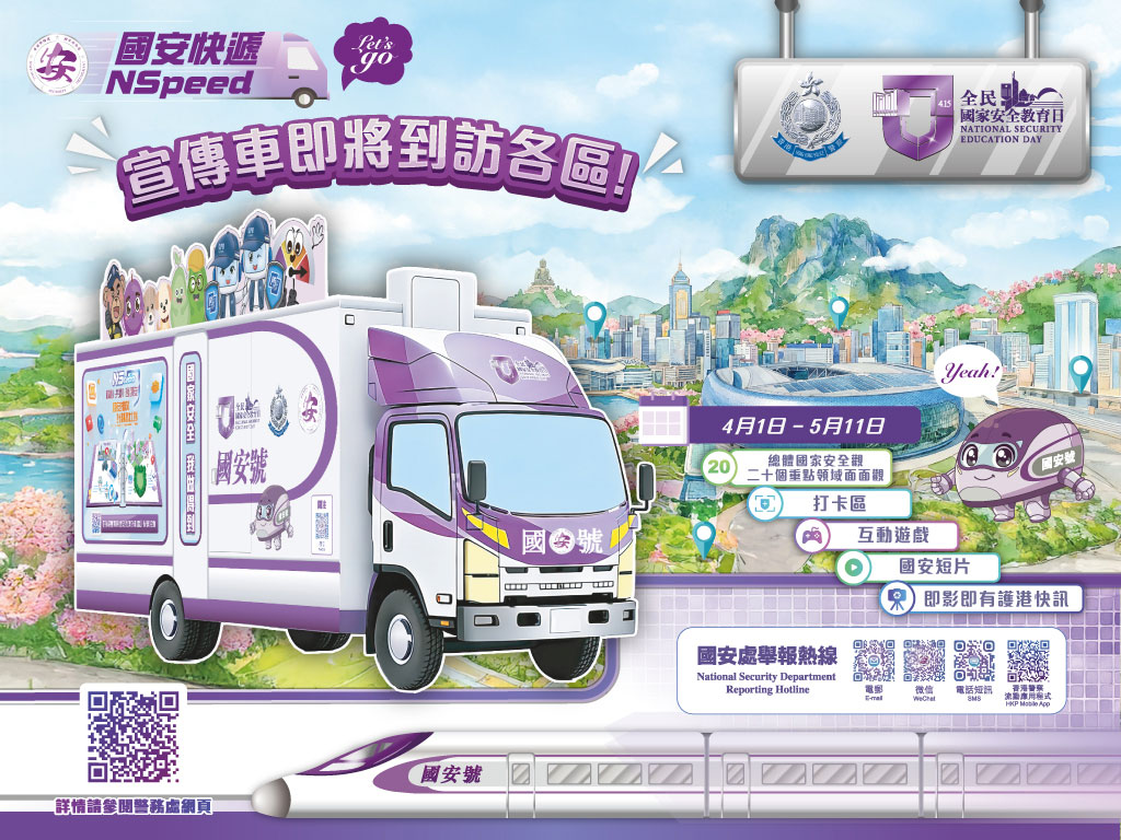 於4月1日至5月11日,全新設計的「國安號」宣傳車再次出動,走訪全港各區不同學校、地標及人流較多的街道,透過互動遊戲、潮流打卡點及精美即影即有護港快訊,提升年青人和公眾的國家安全意識。