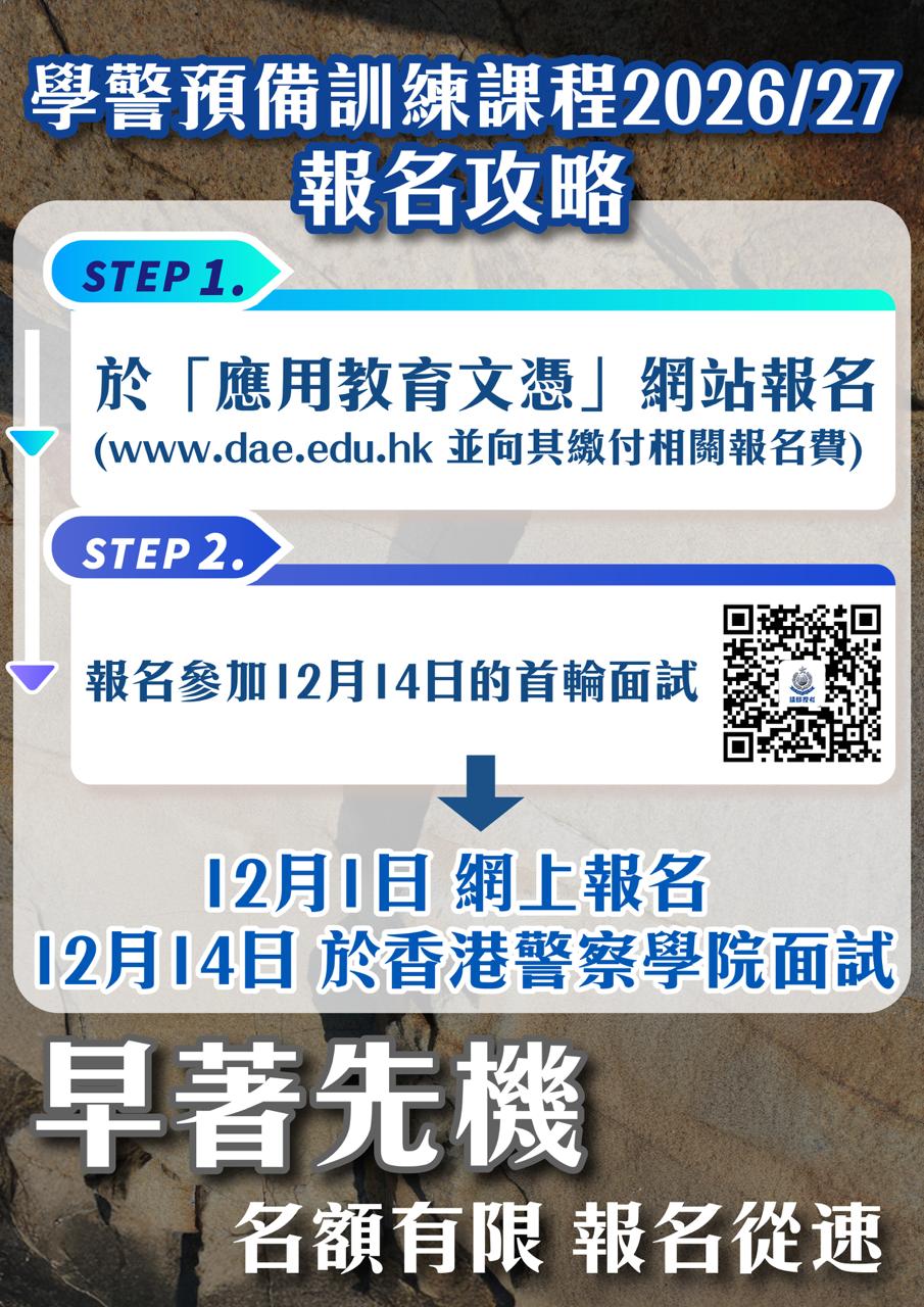 2026/27學年「應用教育文憑 - 學警預備訓練」課程將於2026年9月開班,首階段報名日期由2025年12月1日至2026年2月28日。